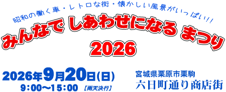 | レトロカーマニアの方だけでなく、ご来場いただくお客様、車両展示・物販・イベント等で参加する方、商店街の人たち、このまつりのスタッフ... 関わった人たちみんなが、秋の一日を幸せな気持ちですごせますようにと願い名づけました。 | |