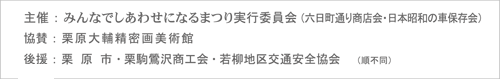 | 今より便利じゃなかったし、それほど豊かでもなかったけれど、ひとにもまちにも活気があった古きよき昭和の時代を「六日町通り商店街」に再現します。 どこか懐かしい雰囲気の街を散策しながら、レトロな車を観たり、いなかの味を堪能したり... 来て・見て・楽しめる、手づくりのおまつりです。 |